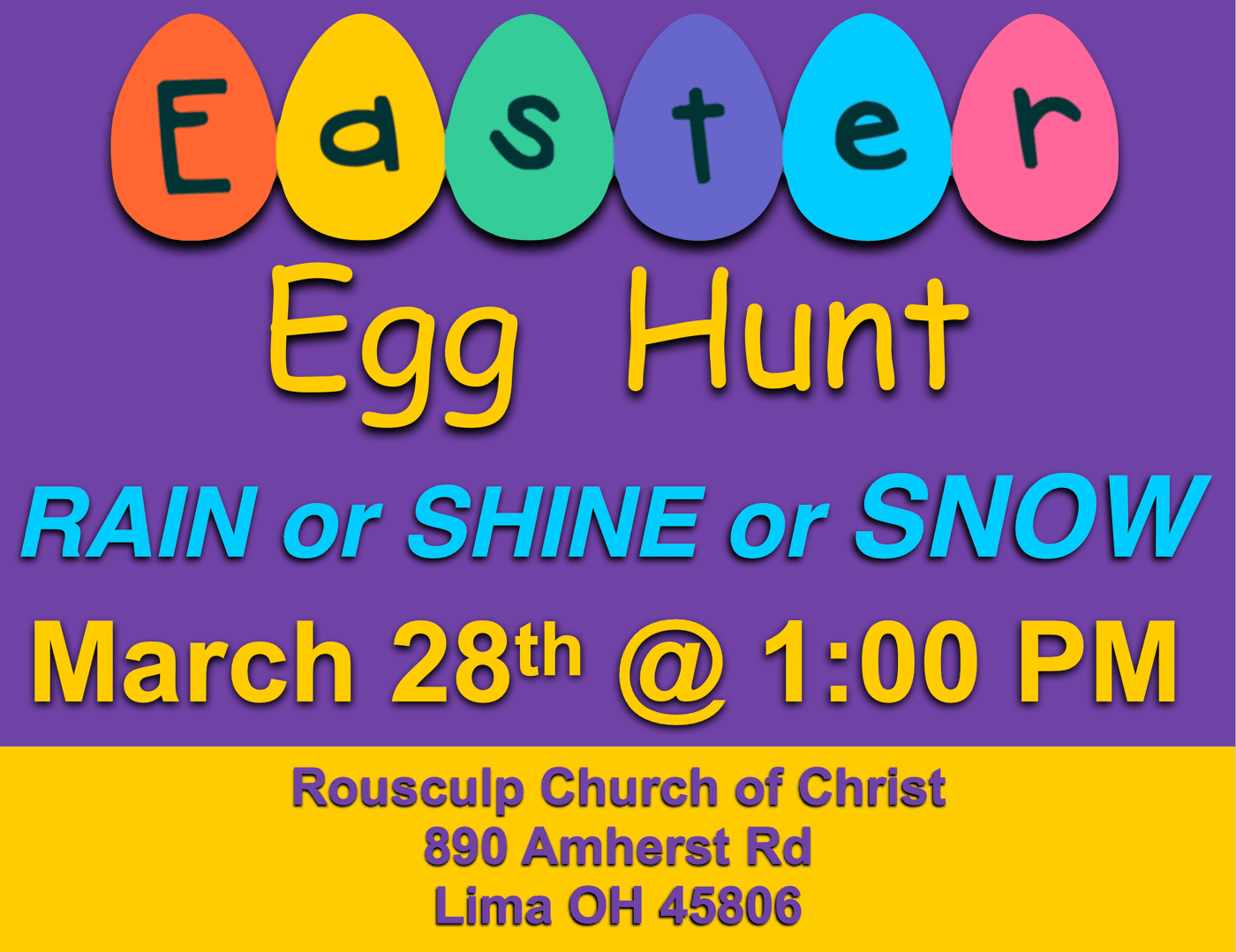 Our Easter Egg Hunt is coming up! Join us for lots of candy and prizes! It's for kids aged preschool-5th grade. We'll have 2 hunts, 1 for preschool-3rd grade, and one for 4th-5th grade. We hope you can join us!